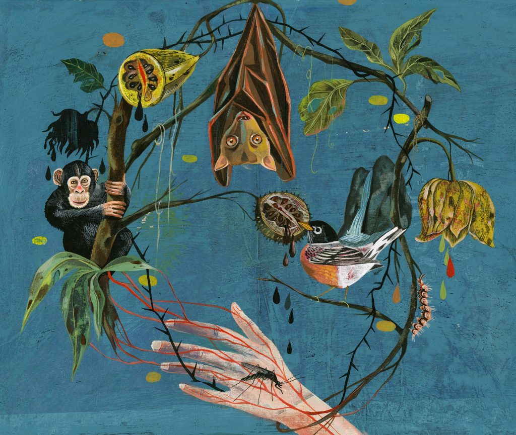 The Nipah virus in South Asia, and the closely related Hendra virus in Australia, both in the genus of henipah viruses, are the most urgent examples of how disrupting an ecosystem can cause disease. The viruses originated with flying foxes, Pteropus vampyrus, also known as fruit bats. They are messy eaters, no small matter in this scenario. They often hang upside down, looking like Dracula wrapped tightly in their membranous wings, and eat fruit by masticating the pulp and then spitting out the juices and seeds
